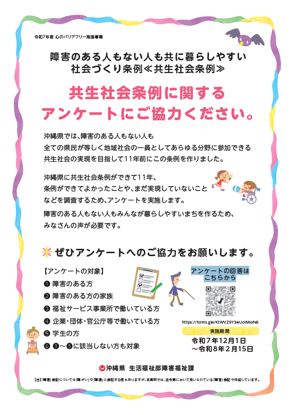 沖縄県に共生社会条例ができて11年、条例ができてよかったことや、まだ実現していないことなどを調査するため、アンケートを実施します。