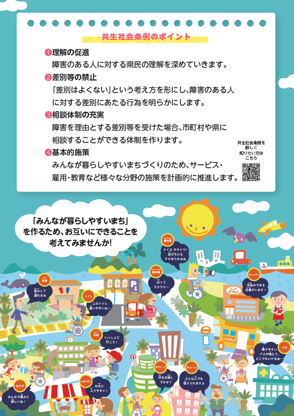 沖縄県では、障害のある人もない人も全ての県民が等しく地域社会の一員としてあらゆる分野に参加できる共生社会の実現を目指して11年前にこの条例を作りました。
